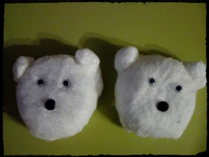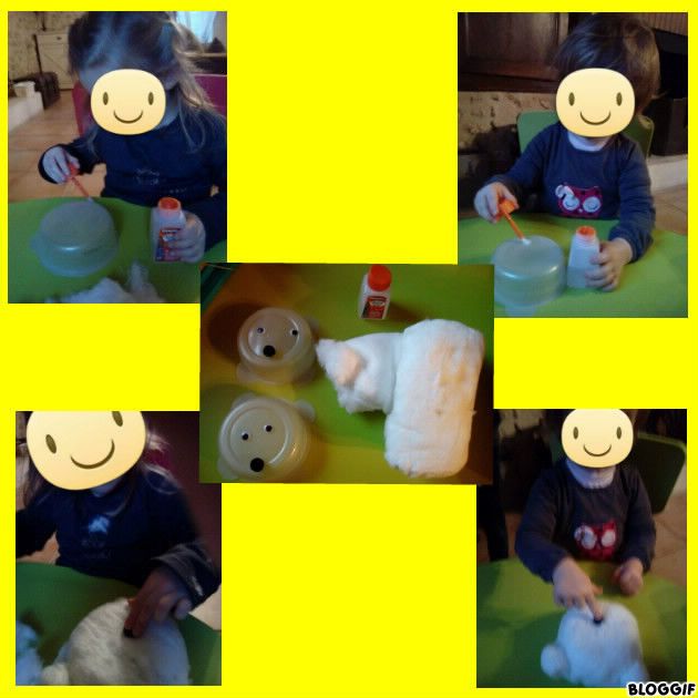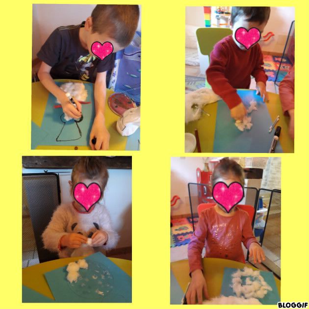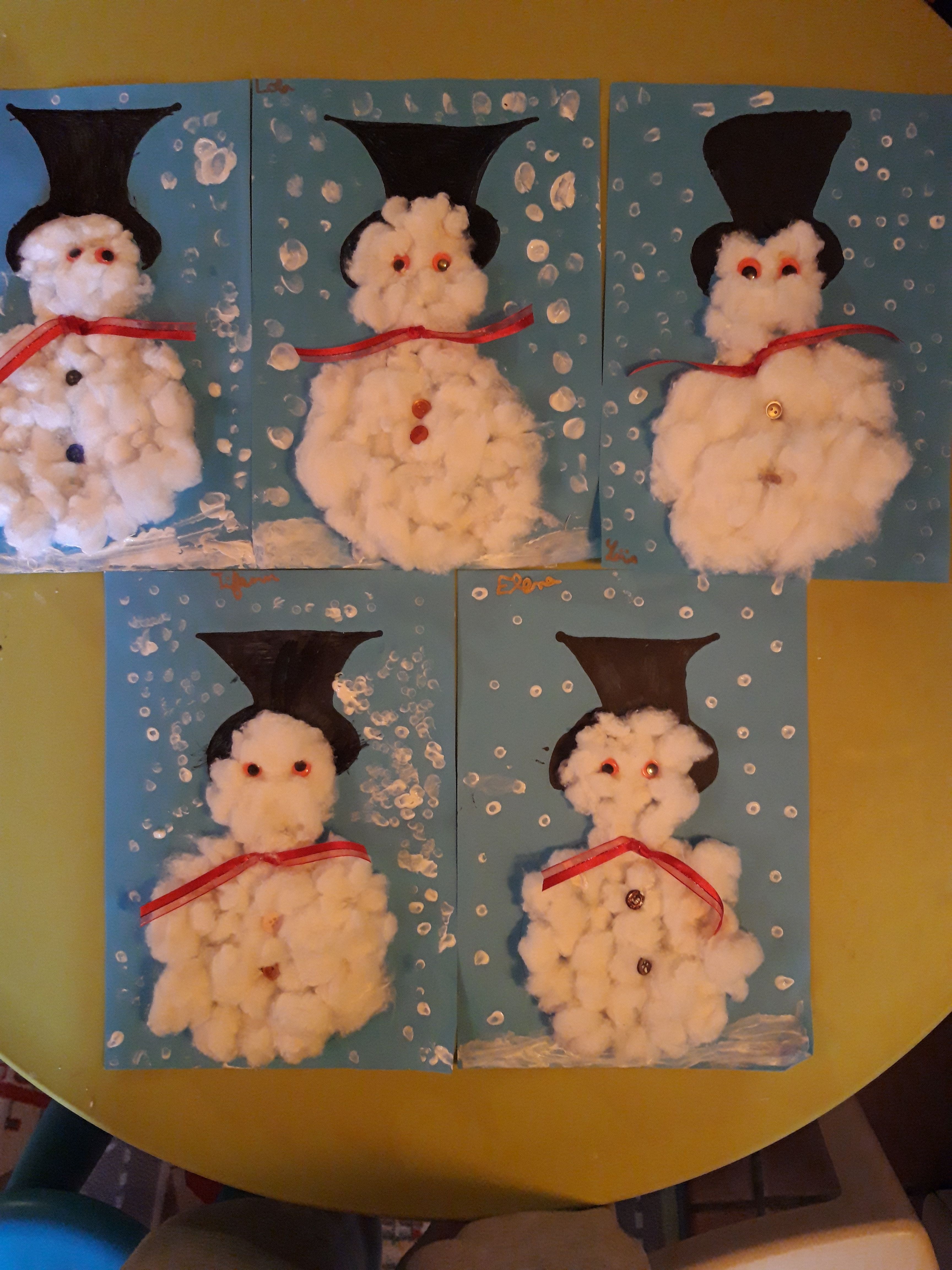sur une feuille dessiner le gabarit du bonhomme de neige puis les enfants collent le coton à l interieur, puis ils colorient en noir le chapeau .ils ont collé des yeux mobiles, des petits boutons ainsi qu un joli ruban rouge.Puis à l aide d un coton tige ou au doigt et de la peinture ils ont fait de la neige