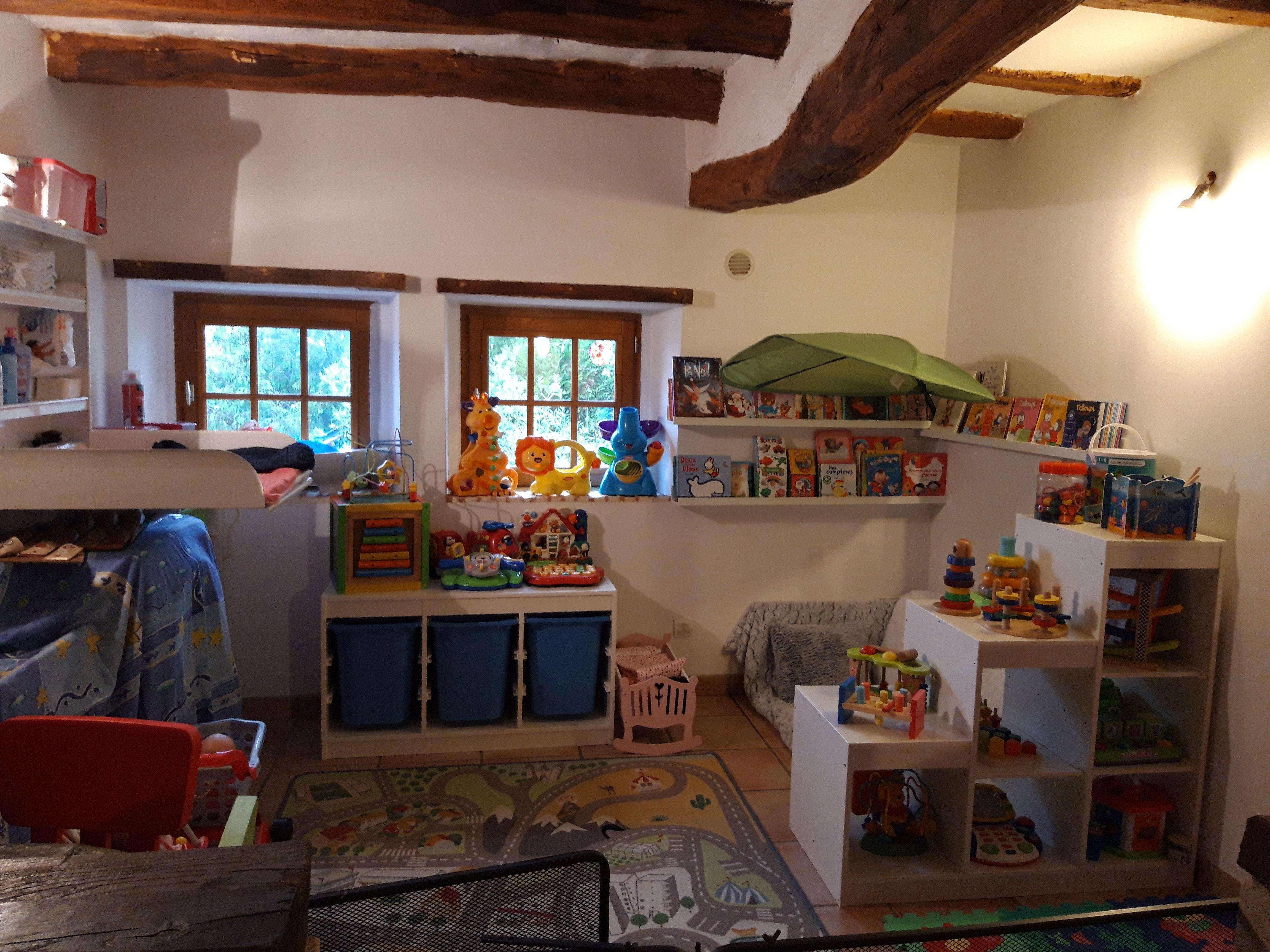 Notre maison est spacieuse avec une salle de jeux aménagée pour les enfants.