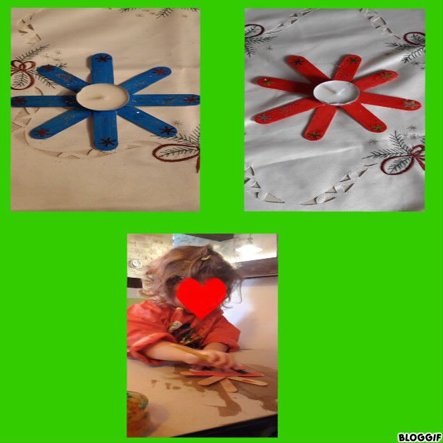 Elena et Tifenn ont fait une décoration de table pour noël avec des batonnets à peindre, des strass qu elles ont collé et des paillettes.