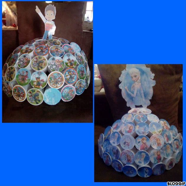 Avec des gobelets agrafés des images de la reine des neige et pat patrouille que j ai imprimé