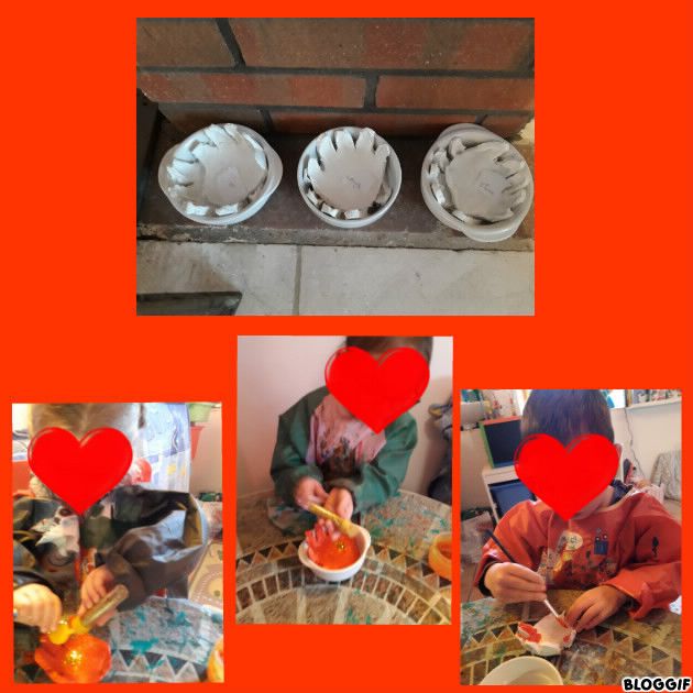 Chaque enfant à choisi la couleur de sa feuille cartonnée , ils ont collé les yeux,le nez et décoré avec des gommettes et nounou à dessiné les bois et mis un petit ruban autour .