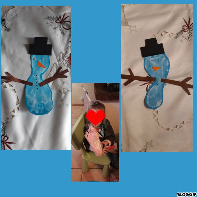 avec l empreinte de leur pied à la peinture blanche sur une feuille bleue Elena et Tifenn ont fait un bonhomme de neige comme olaf