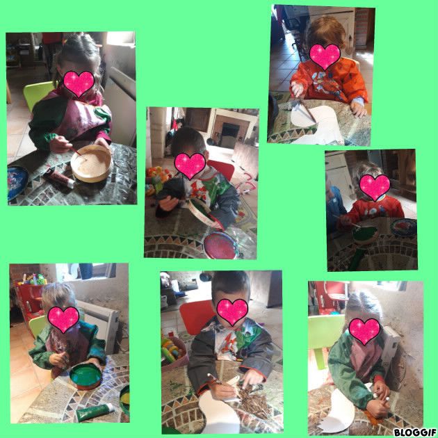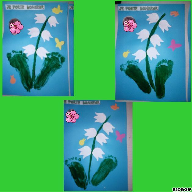 avec les empreintes de pieds à la peinture verte nous avons fait les feuilles, puis les enfants ont collé avec l'aide de nounou les clochettes découpéés dans du papiers blanc ainsi que quelques gommettes