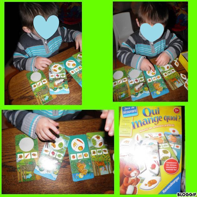 Lorenzo et nounou jouent à "qui mange quoi" connaissance des animaux, concentration et motricité fine .